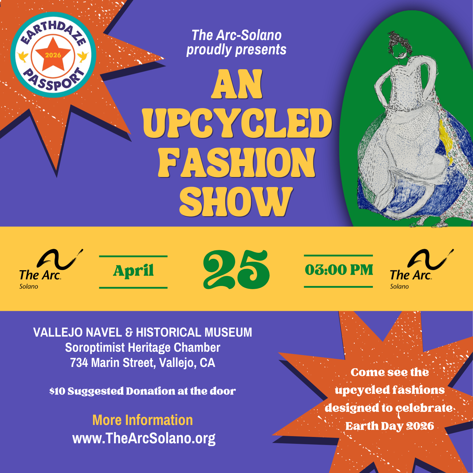 The Arc-Solano is proud to present An Upcycled Fashion Show as part of Vallejo's Earth Daze 2026 Festival! Come to downtown Vallejo on Saturday, April 25, to celebrate Earth Day 2026 between 10 am and 4 pm. This is a local, environmentally friendly, family-oriented festival to educate and inspire students, parents, and businesses to reduce or eliminate the use of plastics for the sake of humanity and planetary health.